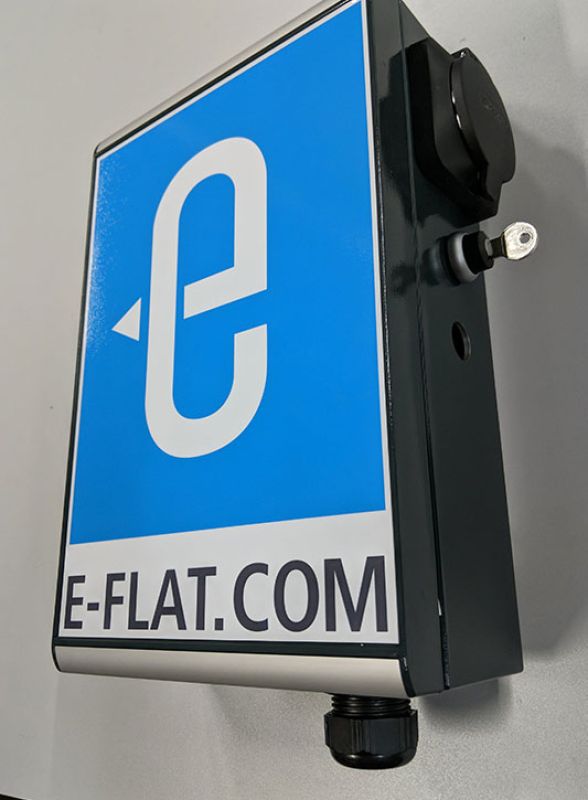 Dieser Schnell-Ladepunkt verfügt seitlich rechts über eine Typ2 Dose, um E-Fahrzeuge aufzuladen. Er kann in Pfahl- oder Wandmontage angebracht werden, verfügt bereits über notwendige Schutzschalter und erlaubt die Aufladung jeweils über einen Schlüsselschalter. Es fallen keine Wartungs- oder Roamingkosten an, da eine Abrechnungsfunktion nicht vorgesehen ist.